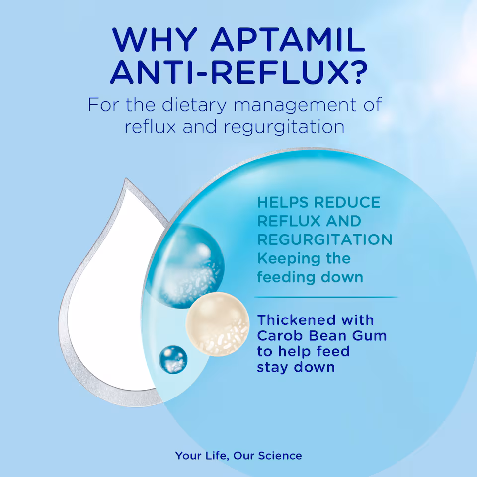 Inspired by 40 years of research in early life science, our team have developed Aptamil Anti-Reflux Milk, nutritionally complete* and specifically designed for the dietary management of frequent reflux and regurgitation.Made with Carob Bean Gum to help your baby’s feeds stay down, Aptamil Anti-Reflux is nutritionally complete* and suitable from birth to 12 months.If you think that your baby has frequent reflux or regurgitation, speak to your healthcare professional. This product should not be used in combination with antacids or other thickeners and is not suitable for premature babies.*suitable as the sole source of nutrition from birth to 6 months and as part of a weaning diet from 6 months to 1 year.IMPORTANT NOTICE: Breastfeeding is best. Aptamil Anti-Reflux is a food for special medical purposes for the dietary management of frequent reflux and regurgitation. It should only be used under medical supervision, after full consideration of the feeding options available including breastfeeding. Suitable for use as the sole source of nutrition for infants from birth and as part of a balanced diet from 6-12 months. This product should not be used in combination with antacids or other thickeners and is not suitable for premature infants. Refer to label for details.