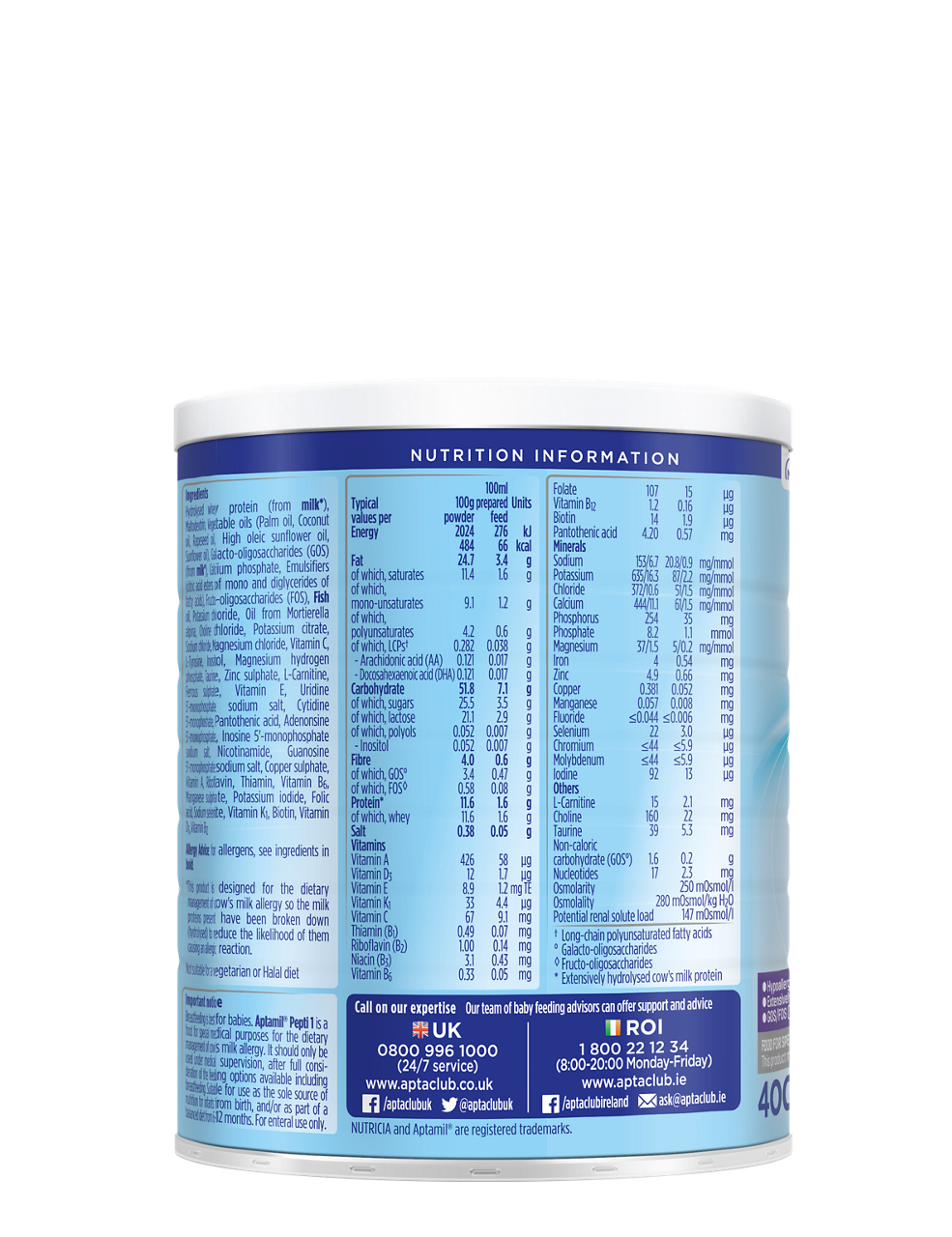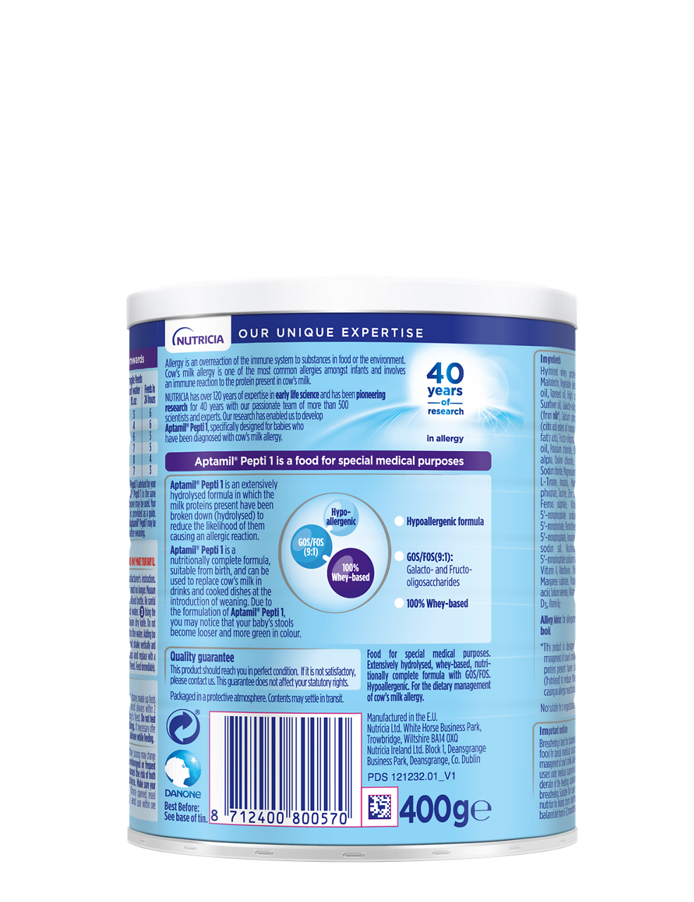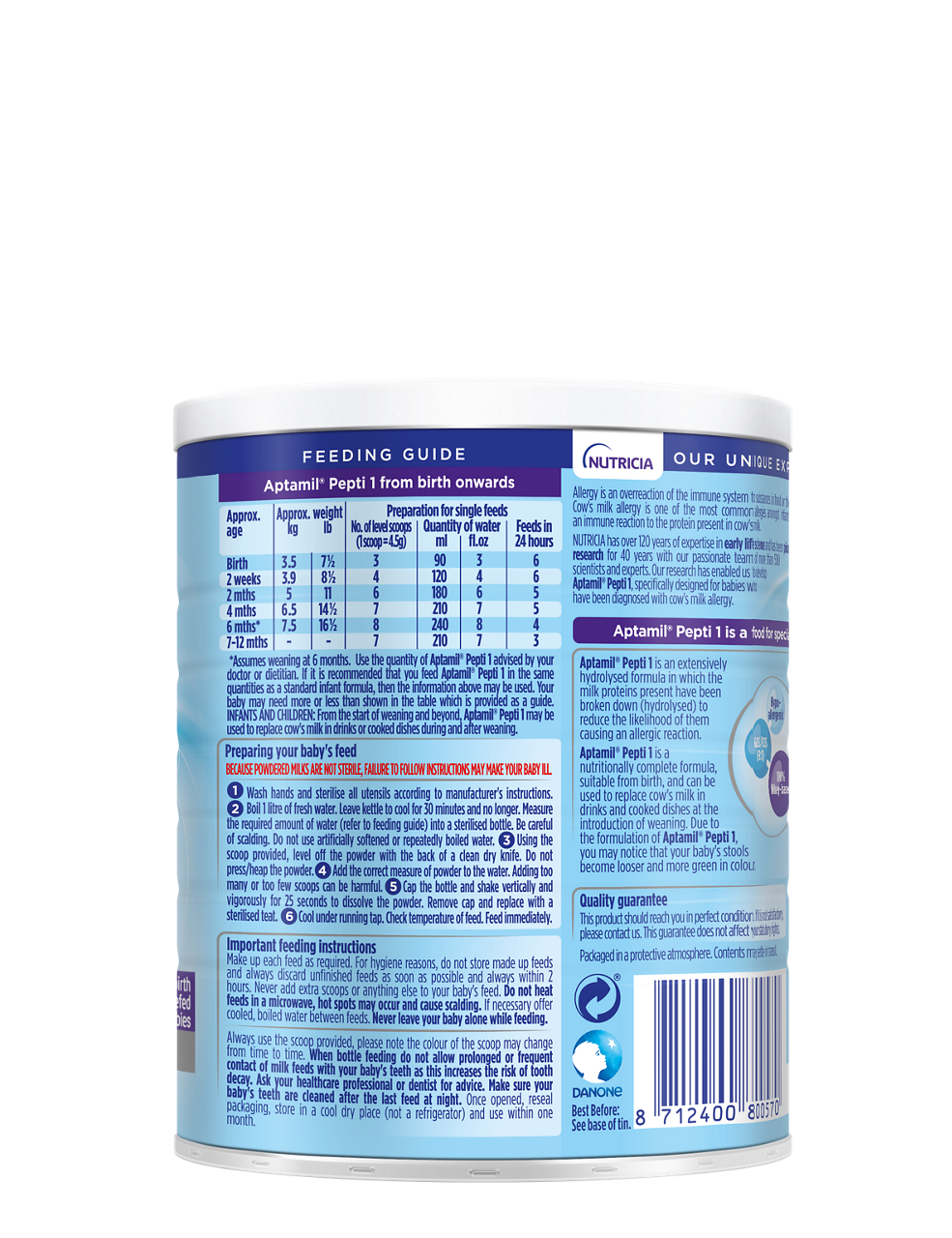 Make up each feed as required. For hygiene reasons, do not store made up feeds and always discard unfinished feeds as soon as possible and always within 2 hours. Because powdered milks are not sterile, failure to follow instructions may make your baby ill. Never add extra scoops or anything else to your baby’s feed. . If necessary, offer cooled, boiled water between feeds. Never leave your baby alone while feeding. Due to the special formulation of Aptamil Pepti, you may notice that your baby’s stools become looser and more green in colour. Aptamil Pepti is a food for special medical purpose. It should only be used under medical supervision, after full consideration of the feeding options available including breastfeeding. Suitable for use as the sole source of nutrition for infants, and as a principle source of nourishment with other foods for children. Always use the scoop provided, please note the colour of the scoop may change from time to time. Do not allow prolonged or frequent contact of feeds with your baby’s teeth as this increases the risk of tooth decay. Ask your healthcare professional or dentist for advice. Make sure your baby’s teeth are cleaned after the last feed at night. This is neither an infant milk substitute nor an infant food. Store in a cool, dry place. Do not refrigerate.