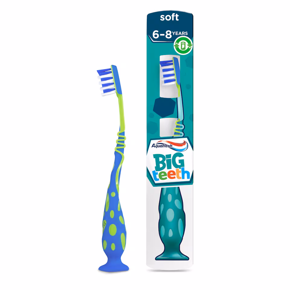 Aquafresh Big Teeth 6-8 Years Soft Bristles ToothbrushThe enamel on new PERMANENT teeth is softer and more vulnerable to decay, and so the new teeth are not as strong as you think. The mix of little teeth, big teeth, and gaps also makes them more difficult to clean. With this in mind, Aquafresh Kids Big Teeth toothbrush is specially developed by dental experts for kids aged 6-8 years old and their special teeth cleaning needs.Designed for mixed teeth, this toothbrush is made with mixed length, special tapered bristles to clean between gaps and designed for effective cleaning of hard-to-reach areas. The unique Aquafresh Flex-Zone helps control pressure when brushing – being gentle on gums while removing plaque.It comes in recyclable packaging made from responsibly sourced, recycled cardboard, with the window made from a special plastic-free film (regenerated cellulose).Explore more from our Kids range. For great results, we recommend using with Aquafresh Kids Big Teeth Toothpaste. Aquafresh Kids Toothbrush is also available for Milk teeth, Little teeth and Advance kids based on the age category of your child.1. SPECIALLY DEVELOPED FOR CHILDREN: Aquafresh Kids Big Teeth toothbrush is specially designed by dental experts for kids aged 6-8 years.2. DESIGNED TO HELP CLEAN MIXED TEETH: Specially made for mixed teeth and the gaps between them.3. BRISTLES AND ERGONOMIC HANDLE: Features mixed bristle lengths for effective cleaning in between teeth and tapered tip designed for effective cleaning of hard-to-reach areas. It also has a comfortable non-slip handle designed to fit your kid’s hand.4. GENTLE ON GUMS: Unique Flex-Zone helps control pressure when your child is brushing, thereby being gentle on gums, while removing plaque.5. PLASTIC FREE, RECYCLABLE PACKAGING: Packaging is made from responsibly sourced, recycled cardboard and the window is made from a special plastic-free film (regenerated cellulose).6. EXPLORE OUR RANGE: For great results, we recommend using with Aquafresh Kids Big Teeth Toothpaste. Aquafresh Kids Toothbrush is also available for Milk teeth, Little teeth and Advance kids based on the age category of your child.