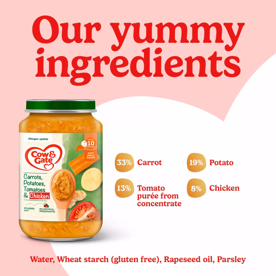 Carrot, potato, tomato and chicken.At Cow & Gate, we believe every spoonful is a milestone in your baby’s weaning journey. That’s why we support your little one every step of the way. Our carrot, chicken & potatoes baby food jar contains soft pieces for the introduction of new textures.• Source of protein, good for growth1• Source of fibre• No added salt*• No artificial colours, flavours or preservativesNeed a chat? For tips and non-judgmental support, our specialist baby advisors and experienced parents are here to talk and encourage confident parenting at every stage. Visit www.cgbabyclub.co.uk / www.candgbabyclub.ie or call us on UK:0800 977 8880 / ROI 1800 570 570*Contains naturally occurring salt. No artificial preservatives as required by legislation.1 Protein is needed for normal growth and development of bone in children.Use as part of a varied weaning diet.• No added salt*• No artificial colours, flavours or preservatives• Source of fibre*Contains naturally occurring salt. No artificial preservatives as required by legislation.Use as part of a varied weaning diet.
