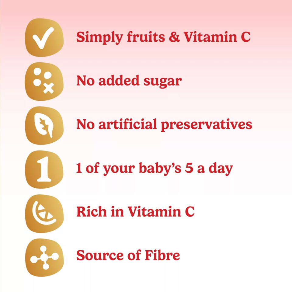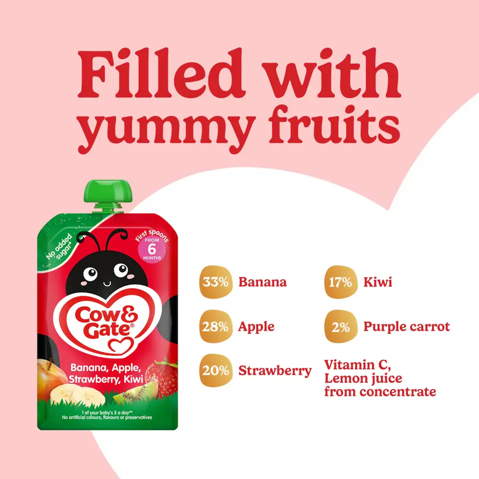 Blend of banana, apple, strawberry, kiwi with added vitamin C.At Cow & Gate, we believe every spoonful is a milestone in your baby’s weaning journey. That’s why we support your little one every step of the way. Discover our banana, apple, strawberry and kiwi baby food pouch, perfect for those first tastes and textures. A yummy blend of real fruits, lemon juice and vitamin C – simple.• Rich in Vitamin C• Source of fibre• 1 of your baby’s 5 a day**• No added sugar*• No artificial colours, flavours or preservatives• Suitable from 6 monthsNeed a chat? For tips and non-judgmental support, our specialist baby advisors and experienced parents are here to talk and encourage confident parenting at every stage. Visit www.cgbabyclub.co.uk / www.candgbabyclub.ie or call us on UK:0800 977 8880 / ROI 1800 570 570*Contains naturally occurring sugars. **1 portion of fruit for a 1 year old = 40-60g, infants will eat less.No artificial preservatives as required by legislation.Use as part of a varied weaning diet