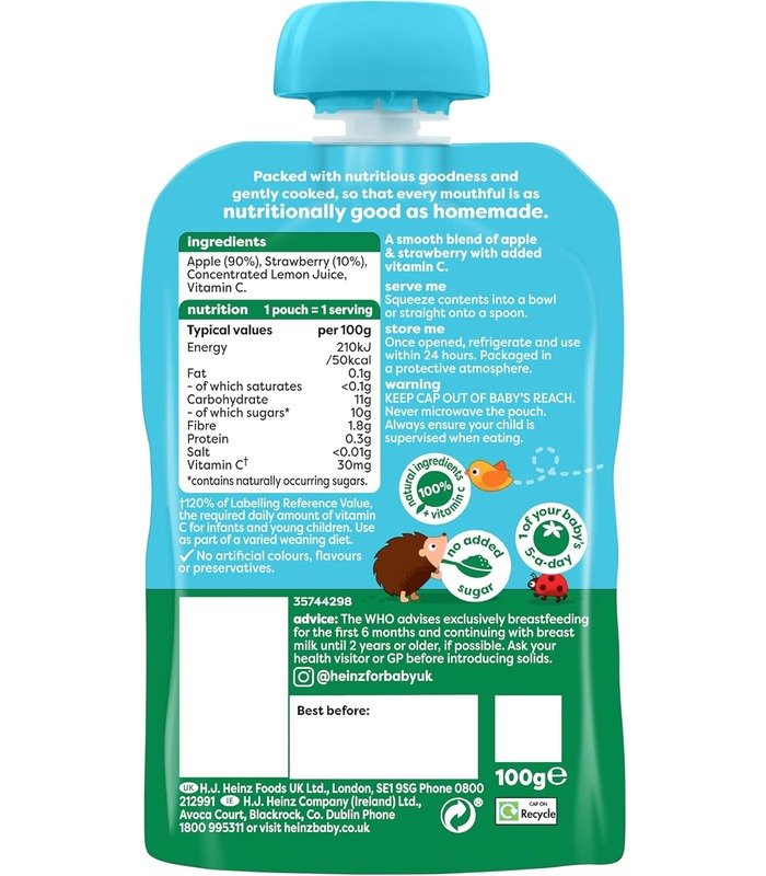 A smooth blend of apple & strawberry with added vitamin CSimply made with love and nothing else added, we select the tastiest ingredients from nature for your little one!Use as part of a varied weaning diet.Heinz Apple & Strawberry Baby Food Fruit Puree Pouch 6+ Months 100g. Simply made with love and nothing else added, we select the tastiest ingredients from nature for your little one!Nappies? Check. Bib? Check. Heinz pouch? Check! Always have a tasty meal to hand with our Heinz Apple & Strawberry Baby Food Fruit Puree Pouch 6+ Months 100g.Squeezable, resealable and packed with nutritious goodness – perfect for meals on the go with your little one.Squeeze contents into a bowl or straight onto a spoon. Never microwave the pouch and always ensure your child is supervised when eating.1 of your baby’s 5 a dayNo artificial colours, preservatives or flavoursLow in salt and absolutley no added sugar