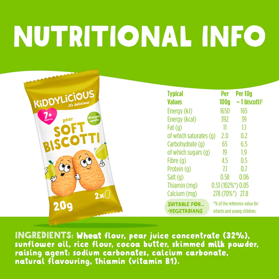 Pear flavoured biscuitsGentle Texture for Little Hands & MouthsOur Soft Biscotti are perfect for little ones to hold and make a yummy snack when mashed into milk.Only Natural Flavours*No Artificial Colours*No Preservatives**As in all baby food