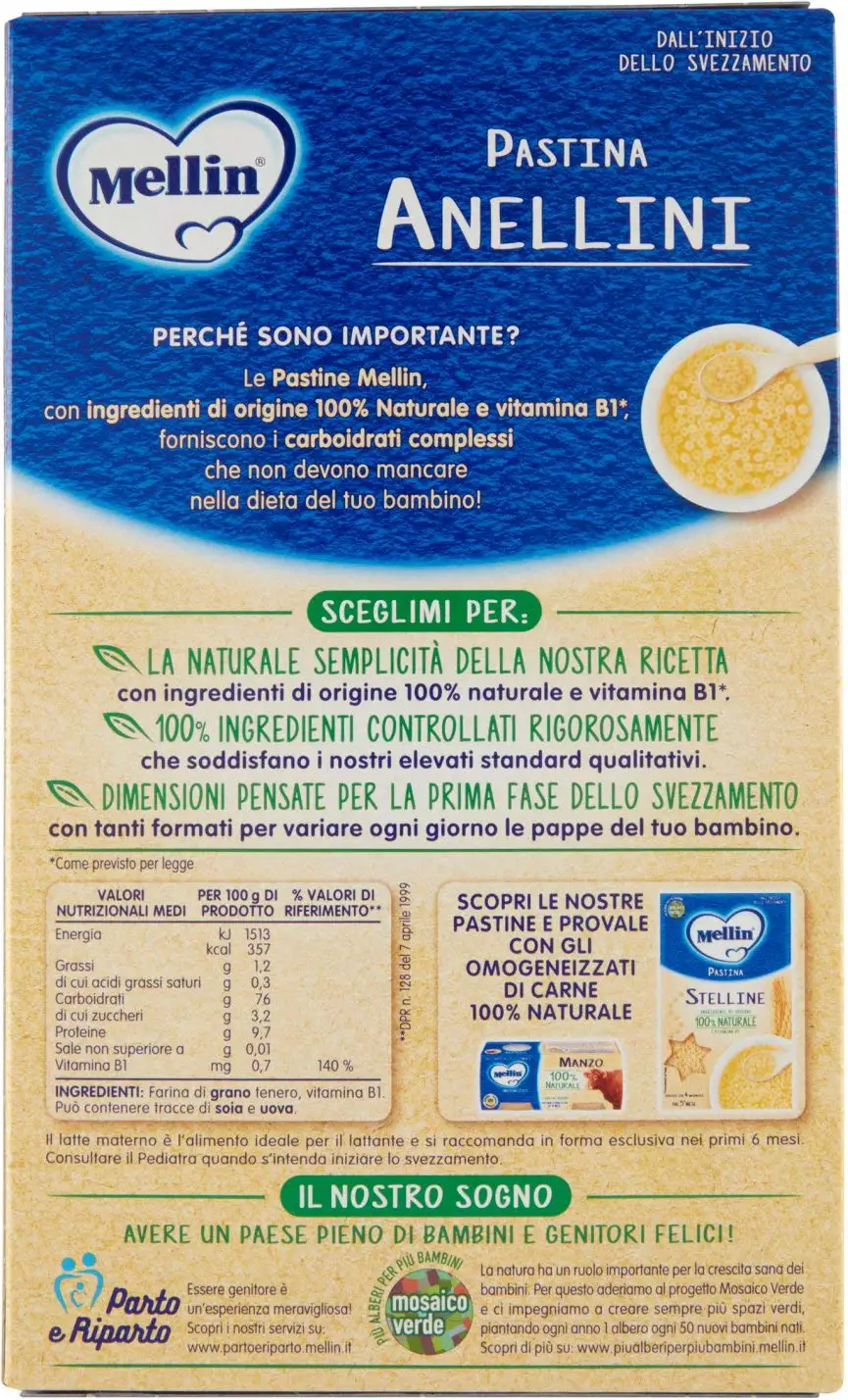 Depending on the type of porridge desired, Pastina Mellin can be cooked in: water, vegetable broth or meat broth. Store the product in a dry place and close carefully after use.