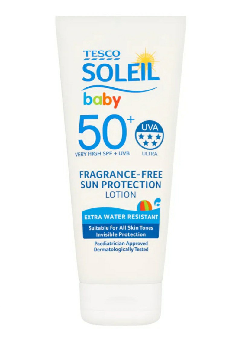 Tesco Soleil Baby Fragrance-Free Sun Protection Lotion SPF50+.Baby SPF50+ Very High SPF + UVB UVA 5* Ultra [logo] Fragrance Free Sun Protection Lotion Extra Water Resistant [light blue bar] Suitable for all skin tones. Invisible protection [dark blue bar] Paediatrician approved Dermatologically TestedThis fragrance-free sensitive lotion cares for babies’ delicate skin. Dermatologiceally tested and Paediatrician approved, this formula is easily absorbed and moisturising. Suitable for all skin tones, blends into skin for invisible protection